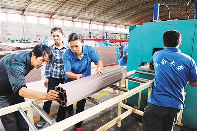 近日,海口桂林洋经济开发区驻区企业工人在生产新型环保建筑材料,准备运往大洋彼岸的巴布亚新几内亚,将为这个国家建造500套木塑公寓别墅。